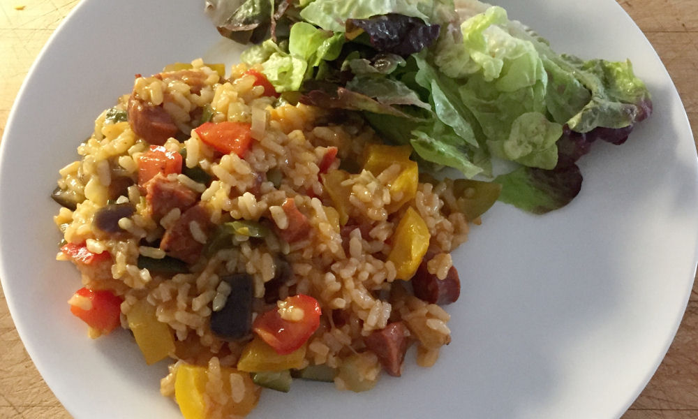 Leuk aan de Spanjaarden is dat ze hun eten delen… op terrasjes zie je ze altijd gezamenlijk van bordjes prikken. Tapas lenen zich daar natuurlijk bij uitstek voor. Maar de Spaanse keuken is veel meer dan tapas (en dat is weer veel meer dan die zielige balletjes gehakt in een vaag sausje, dat ze hier albondigas durven te noemen). De Spaanse keuken is ook veel dan meer paella, toch lijkt dit recept er een beetje op. Het oorspronkelijke recept heb ik van het programma Áqui La Tierra van TVE, een aanrader als je van Spanje houdt en/of Spaans aan het leren bent.