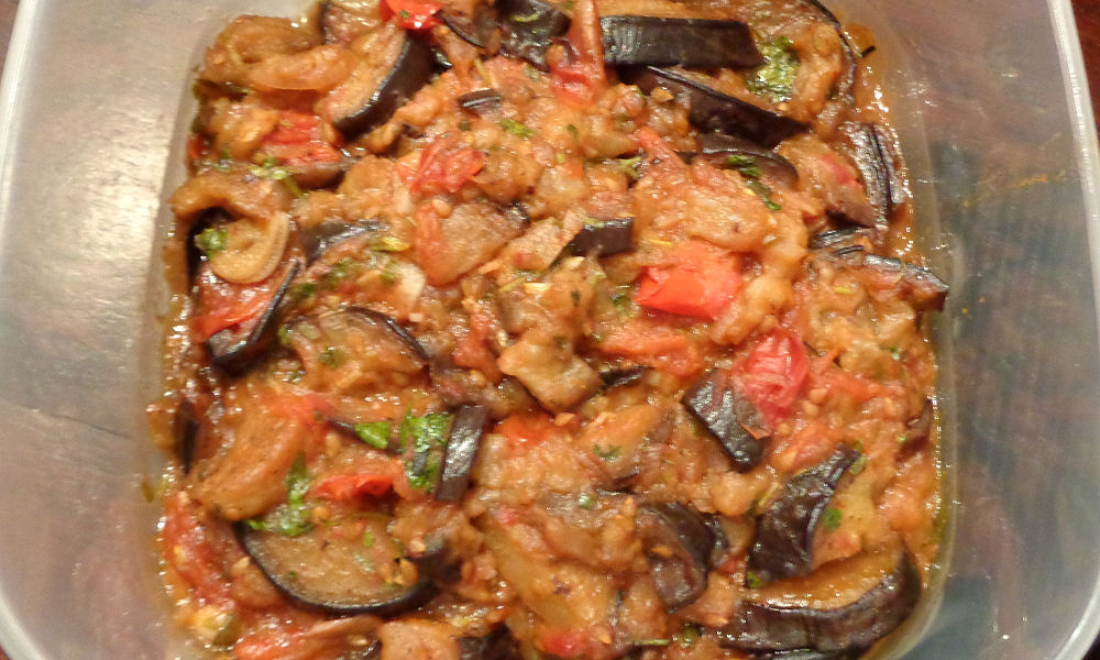 Snij twee grote aubergines in plakken van 1 cm. Dat mag in de lengte of in ronde plakken. Bak de plakken bruin in olijfolie en laat ze daarna uitlekken op keukenpapier en snij ze dan in repen of in blokjes. Snij vier of vijf sjalotjes heel fijn en smoor die in wat olie in een pan met dikke bodem. Als ze glazig worden doe je er de aubergine bij en 6 tot 8 tomaten die in vieren gesneden zijn en een aantal tenen knoflook in plakjes of kleine stukjes. Een stuk of vier zes tenen is wel genoeg. Doe er ook een half glas rode wijn bij. Rode dus! Laat minimaal een half uur zachtjes pruttelen met deksel op de pan en pas op het laatst het deksel eraf maar alleen als er nog wat vocht moet verdampen. Roer een paar minuten voor het klaar is fijngehakte platte peterselie door en wat peper en zout. Voor het serveren mag er ook nog wat peterselie overheen.