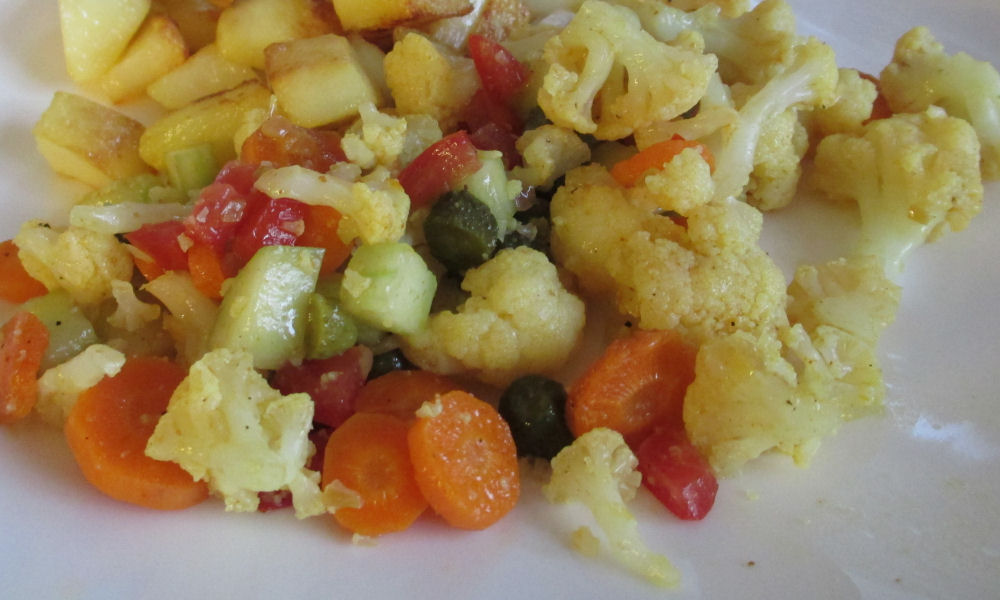 We snijden drie/vier worteltjes in dunne plakjes en smoren die in wat boter en olie samen met een fijngesneden sjalotje. Als de worteltjes bijna gaar zijn scheppen we ze door de bloemkool. Vervolgens hebben we een kwart komkommer geschild, zaadjes eruit in kleine blokjes gesneden. Een kleine augurk en twee kleine tomaatjes ook in stukjes en dat scheppen we allemaal door de salade samen met een eetlepel azijn.