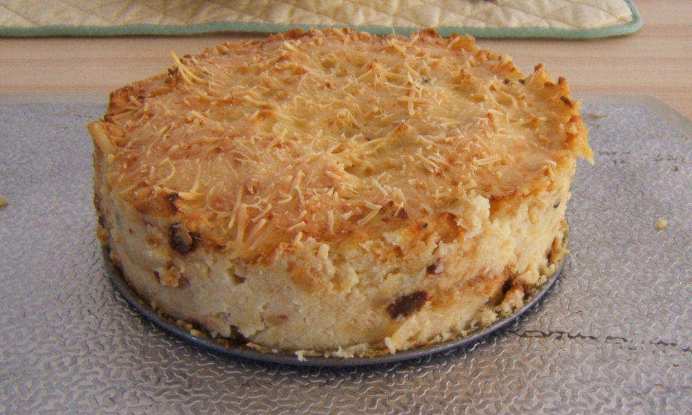 Deze bloemkooltaart maakte manlief gisteravond en zoals altijd was het weer heerlijk. De hoeveelheid aardappelen en bloemkool zijn hetzelfde als bij de gewone warme maaltijd dus die moet je zelf bedenken. Kook de aardappelen en de bloemkool gaar en bak ondertussen 1 of 2 uien in kleine stukjes gesneden. Stamp de hele boel door elkaar samen met twee eieren (bij een taart voor twee personen), wat mosterd, boter en geraspte kaas. Wat we er voor de rest nog doordoen is iedere keer weer anders. De taart op deze foto bevat verder nog wat zongedroogde tomaatjes en kappertjes. Uitgebakken spekjes is een optie maar ook fijngesneden zwarte olijven. Verzin maar wat. Beboter een springvorm en bestrooi de binnenkant met bloem. Alles erin en nog wat kaas erover. In de oven op 175 graden en 45 minuten later zit je te smullen. Het zal duidelijk zijn dat je deze taart een paar uur van te voren in de vorm klaar kunt zetten. Makkelijk en toch iets bijzonders als je eters krijgt. Komkommersla doet het natuurlijk altijd goed bij bloemkool maar ook een schaaltje piccalilly is fijn.