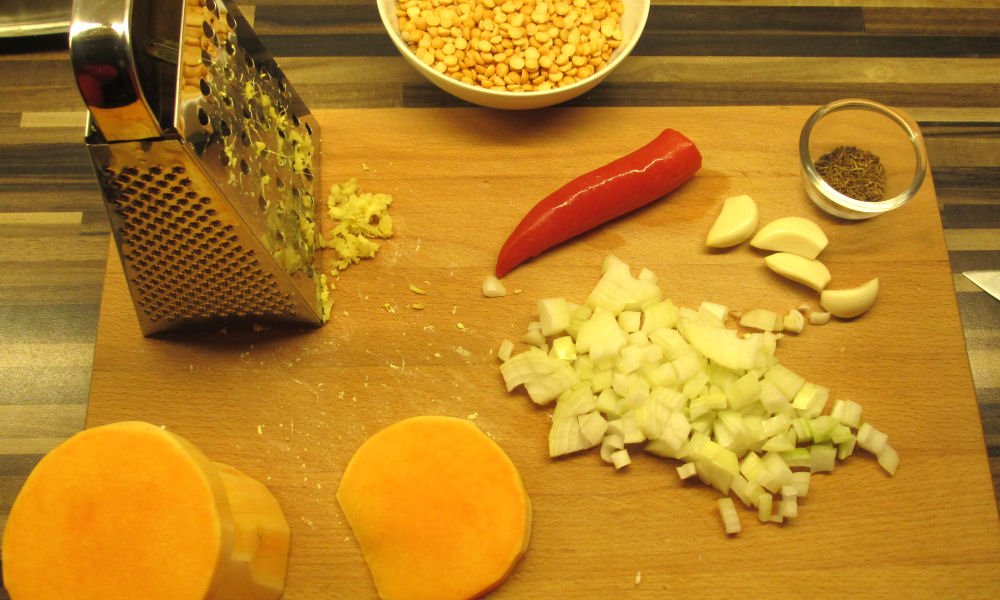 Vier tenen fijngesneden knoflook, een in ringetjes gesneden rode peper, 1/2 theelepel komijnzaad, 1/2 theelepel zwart mosterdzaad (hoeft niet als je het niet in huis hebt), een fijngesneden ui, 3 cm verse gember geraspt, 300/400 gram flespompoen geschild en in blokjes, 250 gram rode splitlinzen, 1 theelepel garam masala.