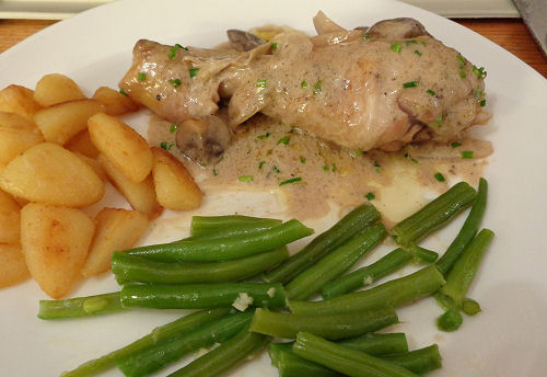 Twee dikke drumsticks en twee kippedijen (met of zonder bot) peper en zouten en aan alle kanten licht bruin braden in boter. Haal het even uit de pan en doe er dan twee sjalotjes in stukken, acht gekneusde tenen knoflook (twee zegt het recept) en 150 gram in vieren gesneden champignons in. Na een paar minuten roerbakken mag de kip er weer bij en gaan we afblussen met een klein glaasje witte wijn. Laat het een beetje inkoken en doe er dan een half potje crème fraîche (dus 100 gram) bij, een klein pakje slagroom (200 ml) en een bouquet garni bij. Heb je die niet dan kies je voor wat gedroogde kruiden zoals tijm, peterselie en een laurierblad. Laat alles 25 minuten sudderen en maak het af met een kneepje citroensap. Bestrooi met bieslook.