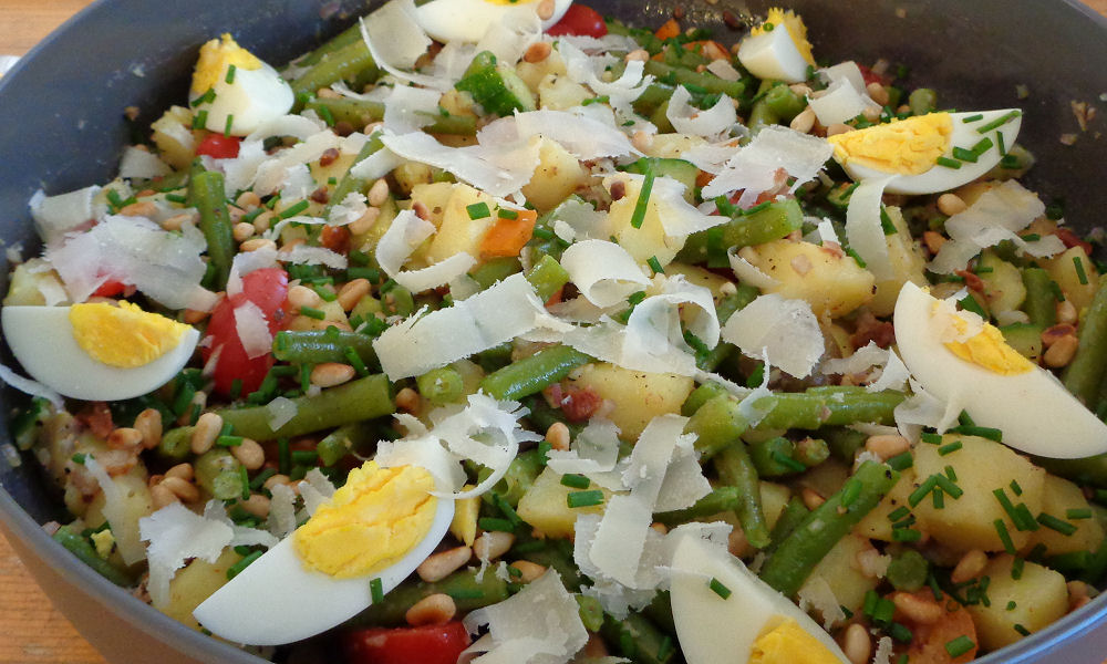 In een grote schaal doen we eerst wat kleine tomaatjes, komkommer, twee sjalotjes en wat paprika in stukjes gesneden. We scheppen dat om met flink wat olijfolie, azijn, peper en zout. We snijden de aardappelen in blokjes en de sperziebonen in stukjes en koken die net gaar. Afgieten en door de rest van de salade scheppen. Bestrooien met geroosterde pijnboompitten en fijngesneden bieslook. Garneren met stukjes gekookt ei en vlak voor het aan tafel gaan raspen we er wat parmezaan over. Je kunt deze salade lauwwarm of op kamertemperatuur eten. Zo heerlijk!