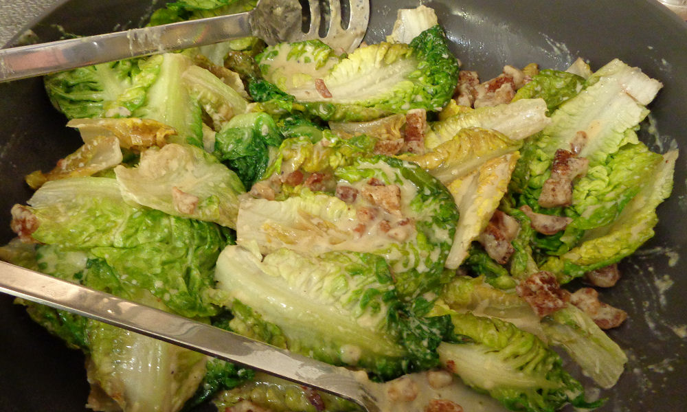 Reken per persoon één krop Little gem, 50 gram (gerookte) baconblokjes en 50 gram blauwe kaas.