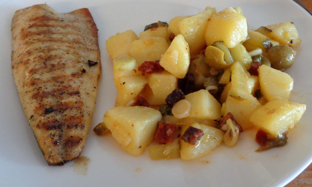 Wij aten het met makreelfilet uit de grillpan. De makreelfilet kreeg een marinade van knoflook, mosterd, citroensap en olijfolie voor het in de grillpan ging.