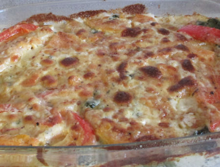 Op de foto boven zie je hoe fijn en kleurig dit er op je bord uitziet. Op de kleine foto zie je hoe smakelijk de schaal eruit ziet als deze uit de oven komt. Een fijn gerecht om helemaal van te voren klaar te maken. De saus schep je er pas overheen net voordat de schaal in de oven gaat.
