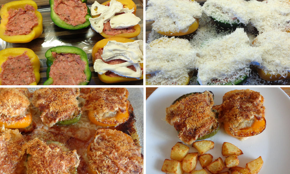 Dan gaan we de boel opleuken. Wij hadden toevallig geitencamembert in huis. Je kunt alle soorten kaas kiezen die je lekker vindt. Gorgonzola, brie, port salut of gewoon een pittige boerenkaas. Allemaal prima. Leg wat plakjes op de gevulde paprika’s, bestrooi het vervolgens met geraspte parmezaan (of oude boerenkaas) en om een lekker bruin korstje te krijgen maken we het af met wat paneermeel of panko.