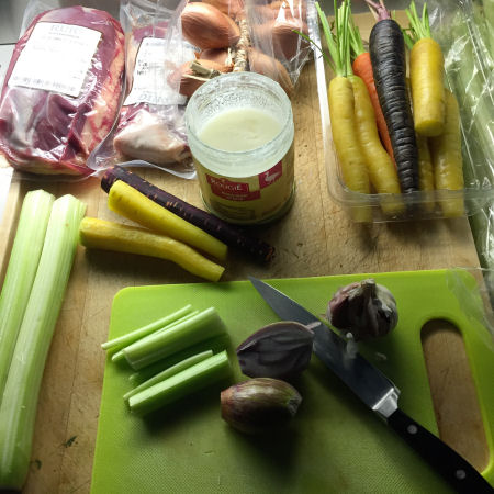 Voor de soffritto: 1 witte ui, 1 winterwortel en 2 stengels bleekselderij