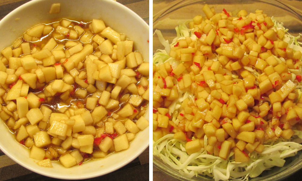 Meng een heel fijngesneden teen knoflook met 3 eetlepels olie, 2 eetlepels azijn, een half ragfijn gesneden rood pepertje, 1 eetlepel vissaus, 1 eetlepel sojasaus, 2 eetlepels gembersiroop en een zachte zoete appel in blokjes gesneden. Dan natuurlijk even proeven en wellicht een beetje meer gembersiroop of een extra scheutje vissaus. Moet het echt pittig zijn? Dan een heel rood pepertje nemen. Net wat je lekker vindt.