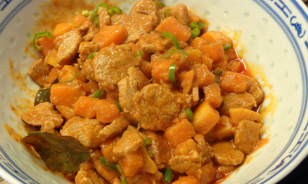 Snij zo’n vier ons varkenshaas of kip in dobbelstenen. Doe een klein scheutje olie en een eetlepel rode Thaise currypasta in een hapjespan of een pan met dikke bodem en roerbak dat een minuut. Dan het vlees erbij en omscheppen tot het bijna gaar is. Er gaat vervolgens een blik kokosmelk (400 ml) bij en eenzelfde hoeveelheid water. Het moet ook geen soep worden dus dat gaat een beetje op gevoel. Laat een kwartiertje sudderen. Ondertussen snijden we een stuk van een flespompoen (400/500 gram) in kleine blokjes (zonder schil) en doen dat bij het vlees samen met 3 djeroek poeroet blaadjes, een eetlepel vissaus en een halve theelepel suiker. Opletten of er genoeg vocht in de stoof zit en anders aanvullen. Laat de hele zwik nog 15/20 minuten sudderen en voeg op het laatst een in dunne ringetjes gesneden groene peper toe.
