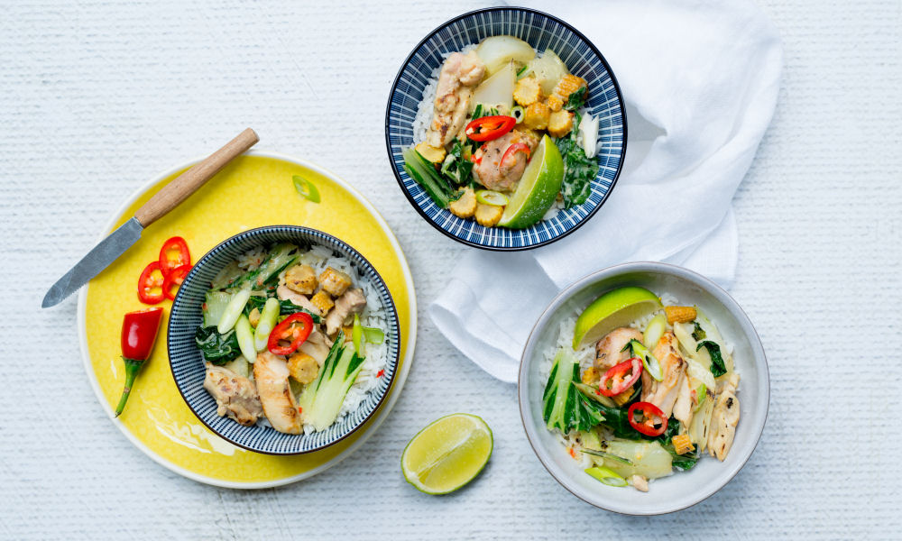 Halveer de limoen en snijd de lente-ui in schuine stukken. Knijp naar smaak limoensap over het gerecht en bestrooi het met lente-ui.