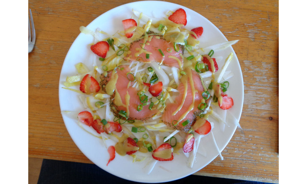 Snij de witlof in hele dunne reepjes en verdeel over een bord. Leg de gravad lax (of zalm) erop. Snij de aardbeien in plakjes en leg die rondom. Snij een lenteuitje in hele smalle ringen en strooi die over de salade. Vervolgens kiezen we een dressing. Dat kan een eenvoudige Franse dressing zijn. Lekker is ook als je dan de wijn vervangt door citroensap en uiteraard mag de scherpe mosterd niet ontbreken. Wil je het wat zoeter dan doe je er wat honing door en wat fijngesneden verse dille maakt het dan helemaal af.
