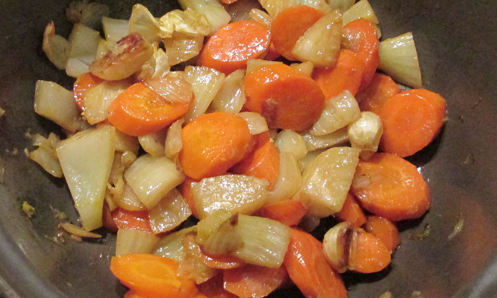 Wij aten wortelen met venkel en knoflook. De helft wortelen in plakjes gesneden en de andere helft venkel in even grote stukken. Er gaat een flinke scheut olie in een pan met dikke bodem en daar mag de groente in samen met een aantal tenen ongepelde knoflook en een beetje zout. Deksel op de pan en smoren maar. Af en toe roeren en na een half uurtje even prikken of de wortel al zacht wordt. Zo niet, dan nog een kwartiertje laten smoren. Voor het serveren mag er wat verse zwarte peper overheen.
